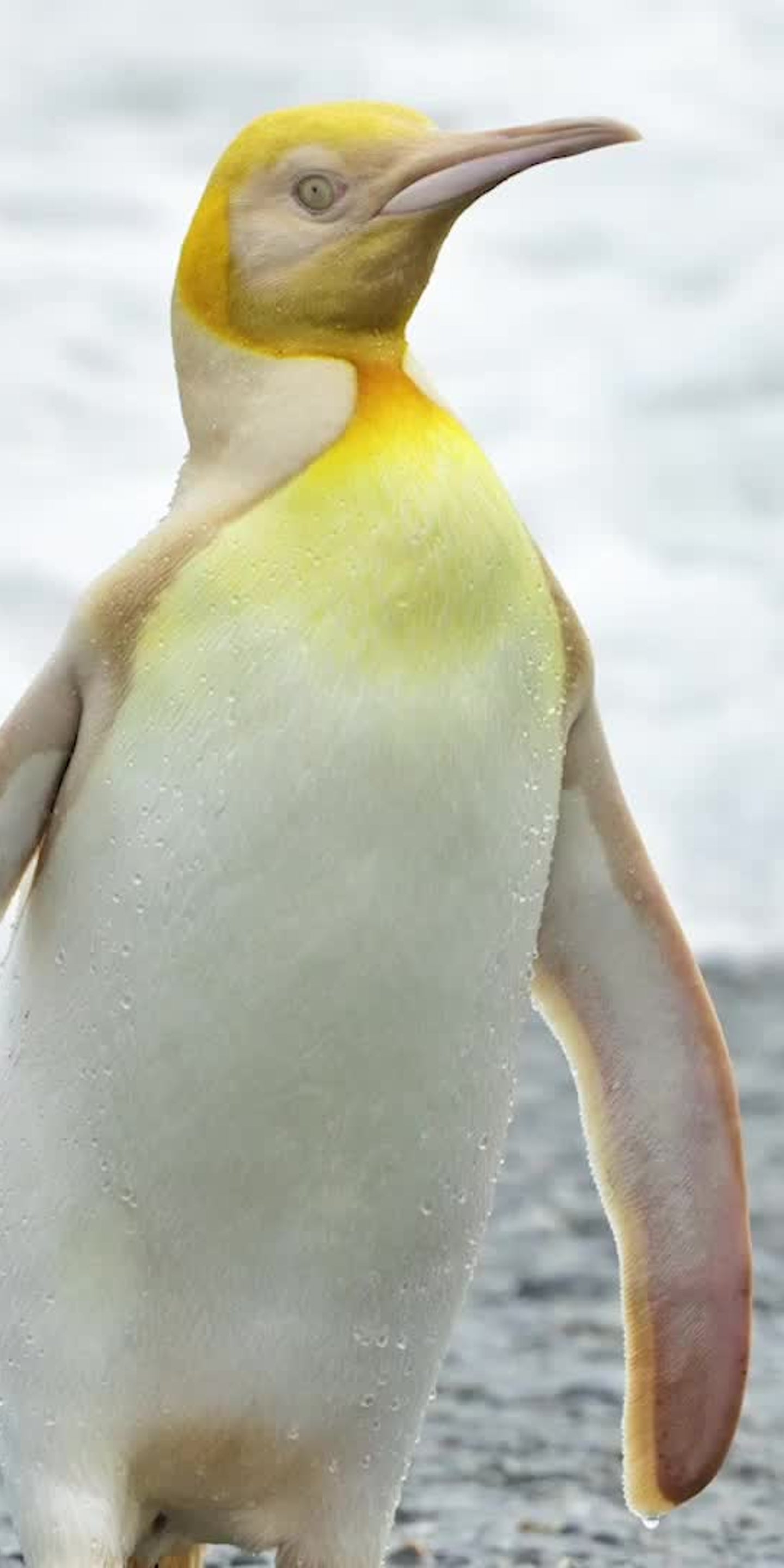 A diferencia de sus pares en la misma isla, este ejemplar no tiene la clásica «vestimenta» negra y blanca con detalles dorados de los pingüinos rey. Por el contrario, pareciera que fue bañado en oro por completo, con los ojos completamente azules y el pico casi rosa.