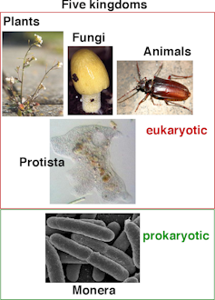 Los procariotas (unicelulares anucleados) se dividieron en dos dominios: bacteria y arquea, cada uno con un único reino. Los eucariotas conformaban un dominio con cuatro reinos: planta, animal, hongo y protista, cuyas fronteras sufrieron también algunos ajustes con el objetivo de alcanzar la monofilia (origen evolutivo único) de los reinos.