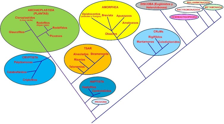 En la figura que sigue a este párrafo, presentamos el árbol filogenético de los eucariotas teniendo en cuenta los últimos estudios publicados. Dicho árbol divide los seres vivos con células nucleadas en 12 supergrupos (aunque otros investigadores han sugerido recientemente 14 supergrupos).